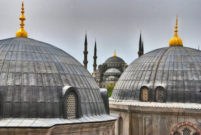 Graue Kuppeln im Vordergrund, dahinter die Blaue Moschee mit ihren filigranen Minaretten – dieser Blick vereint zwei Wahrzeichen Istanbuls in einem Bild. Die runden Formen dominieren die Szene, während die schlanken Türme klare Gegenpunkte setzen. Die Staffelung der Dächer lenkt den Blick direkt ins Zentrum, während die goldenen Spitzen kleine Highlights im eher ruhigen Licht setzen. So entsteht ein starkes Zusammenspiel aus Formen und Linien sowie aus Geschichte und Architektur.